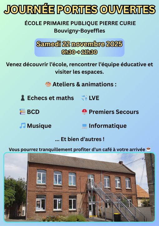 Nous avons le plaisir de vous inviter à notre journée portes ouvertes qui se tiendra le samedi 22 novembre 2025, de 9h30 à 11h30, à l’école Pierre Curie.